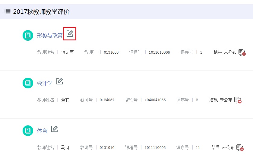 点击页面下方“教师教学评价”图标,打开教师教学评价页面,可以看到页面左下角正在进行中的调查项目。点击“进行中”,打开待评课程和教师列表,点击课程名称旁边的小笔图标,可打开评价页面完成该教师的评价,页面如下图所示。